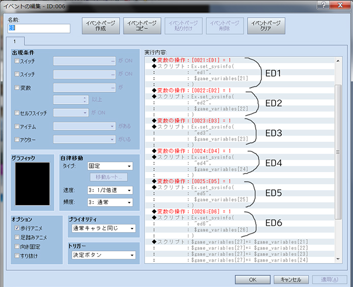 今回はEDが6つあるので、変数21~26を各ED用に使用し、