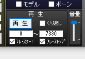 再生ボタンの下に「フレームスタート」「フレームストップ」があります。